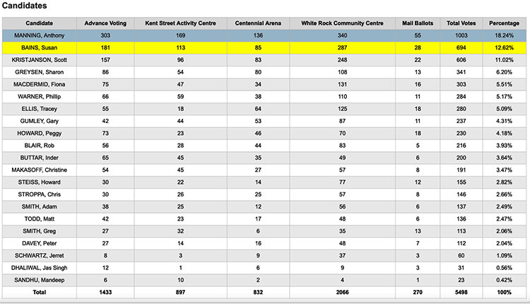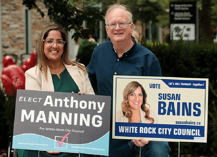 SUSAN BAINS and ANTHONY MANNING Saturday evening were elected to the two vacant seats on White Rock Council. It will be a one year term for the two new councillors.,