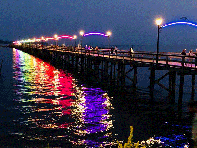 The Pier features coloured lights that enhances the beauty of the waterfront and celebrates annual occasions and/or builds awareness for registered not-for profit (NPO) causes that are important to the White Rock community and its visitors.