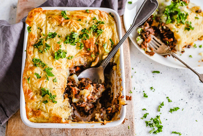 For the topping, mix your mashed potatoes with the plant-based milk, adding salt and pepper to taste, then spread this creamy layer over the lentil mix.