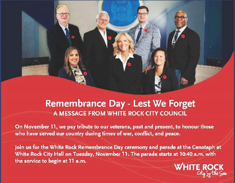 White Rock council members were joined yesterday at the Remembrance Day ceremony by MP ERNIE KLASSEN and MLA TREVOR HALFORD and Dave the classic harley rider in the parade.