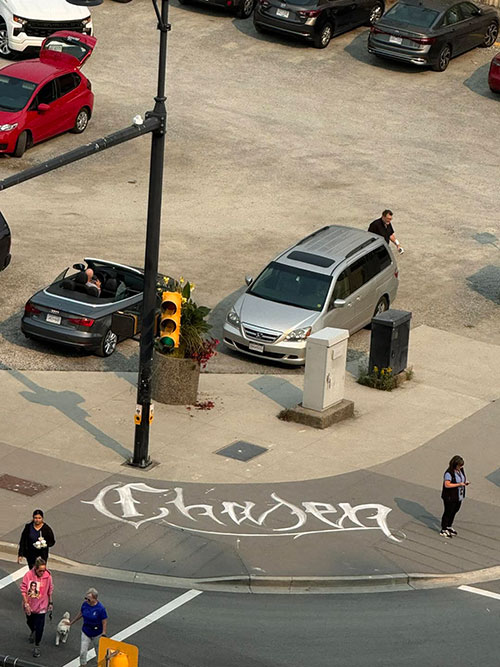 This morning on FACEBOOK David Nash a resident of the Bosa Towers gave us a bird's eye view. Instantly over 100 people had an opinion on what it said, from chosen to chaser to chowder.