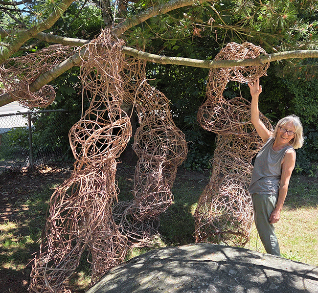 As luck would have it, I met the lady Claire Cilliers, aka Claire Moore, who lived across the street in a house that I had sold them over 20 years ago (yes, it's a very small world).  When I asked her if I knew who was responsible for the latest sculpture at the Crescent School, she revealed that it had been part of an art installation at the Surrey Art Gallery earlier this year by the Z.inc Artist Collective, a contemporary artist group working out of South Surrey of which she was a member. Not only did I not know that Claire was an artist but I had no idea that one of her sculptures had been an integral part of "The Tangled Thicket" that ran in the Surrey Art Gallery from April to June this year.  What made this wisteria and grape vine site specific sculpture so unique was that the vines came from Darts Hill Garden in South Surrey and the piece was mounted both inside and outside through a window of the Surrey Art Gallery.