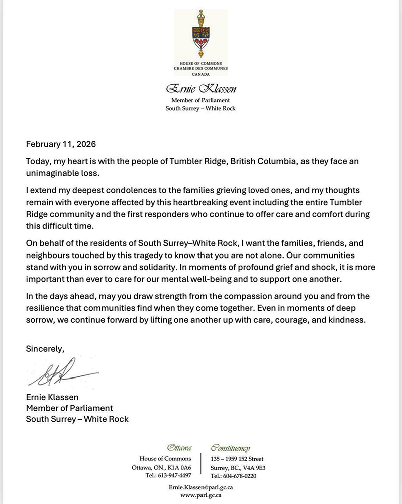 "The tragic events in Tumbler Ridge have left a deep impact on communities across our province, our country, and far beyond. On behalf of White Rock City Council and our community, I offer our sincere condolences to the families, loved ones, and all those affected by this devastating loss.