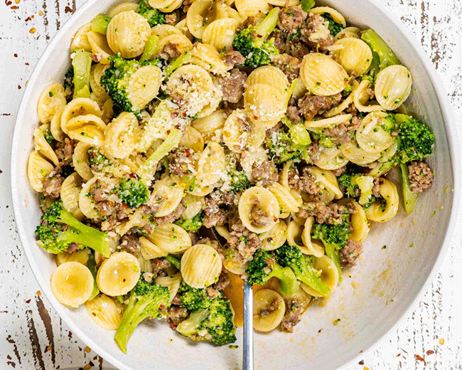 It’s tasty Italian sausage, fresh broccoli, lots of garlic, and a pinch of chili flakes all sautéed together and then tossed with perfectly cooked “little ears” pasta.