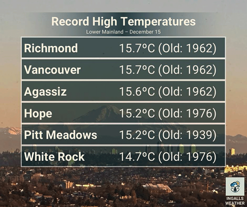 For the date of Dec. 10, records broken in the Fraser Valley include Abbotsford, which reported 86.2 millimetres, Hope, which reported 134.2 millimetres, Agassiz, which reported 91.8 millimetres, and Chilliwack, whose airport reported 110 millimetres of rain — more than doubling the area’s last Dec. 10 record of 52.6 millimetres from 1896.
