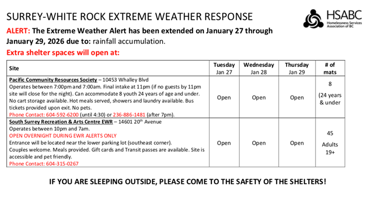 Please see the attached list of open EWR shelters in Surrey-White Rock.