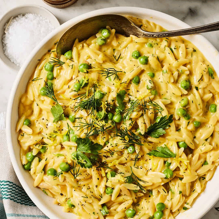 Remove from the heat and add the lemon juice and zest, Parmesan, and half the herbs, stirring until the cheese is melted. Season to taste, stirring in more broth as needed to keep the orzo lightly creamy.
