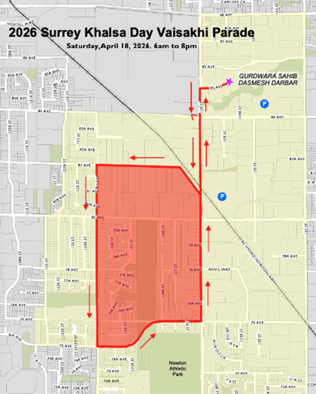 For a full list of road closures and route details, visit: Khalsa Day Vaisakhi Parade | City of Surrey.