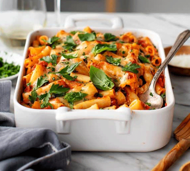 This baked ziti recipe is easy to make and perfect for serving a crowd. Filled with tangy tomato sauce, al dente pasta, and three types of cheese, it's comforting and delicious.