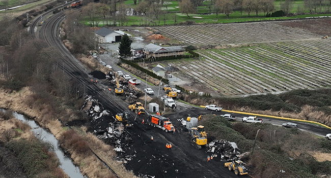 For the second time in just over two years, there has been another large accident involving a BNSF freight train in our region.  On Thurs, Feb. 5 at 9:13 p.m. a BNSF coal train headed from the USA to Westshore Terminals in Delta derailed at the Surrey/Delta border at the west end of Colebrook Road near the Hwy. 99 and Hwy 91 interchange.  This incident happened at a switch station where the tracks go from one to two lanes with one heading north to New Westminster and the other heading west to Robert's Bank.  At this point it is unknown what caused this derailment but 18-20 cars in the middle of the train came off the rails and were destroyed leaving a large pile of coal strewn across the area.  The front end of the train with three locomotives and approximately 60 coal cars stopped just past the Hwy. 91 overpass with a further 40 cars left on the tracks east of the crash scene that measured 135 metres in length.  Fortunately no crew members were injured in this incident and even though containment booms were deployed in nearby ditches, no fuel spillage occurred.