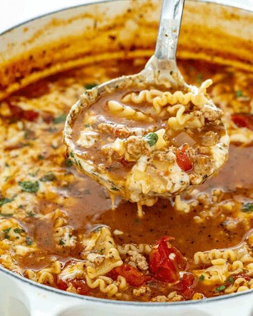 • To serve this scoop a couple ladles in a bowl and sprinkle with mozzarella or Parmesan cheese, then garnish with fresh parsley. Alternatively you can top the soup with mozzarella cheese and place it under the broiler for a couple minutes until the cheese melts and starts to brown a bit.
